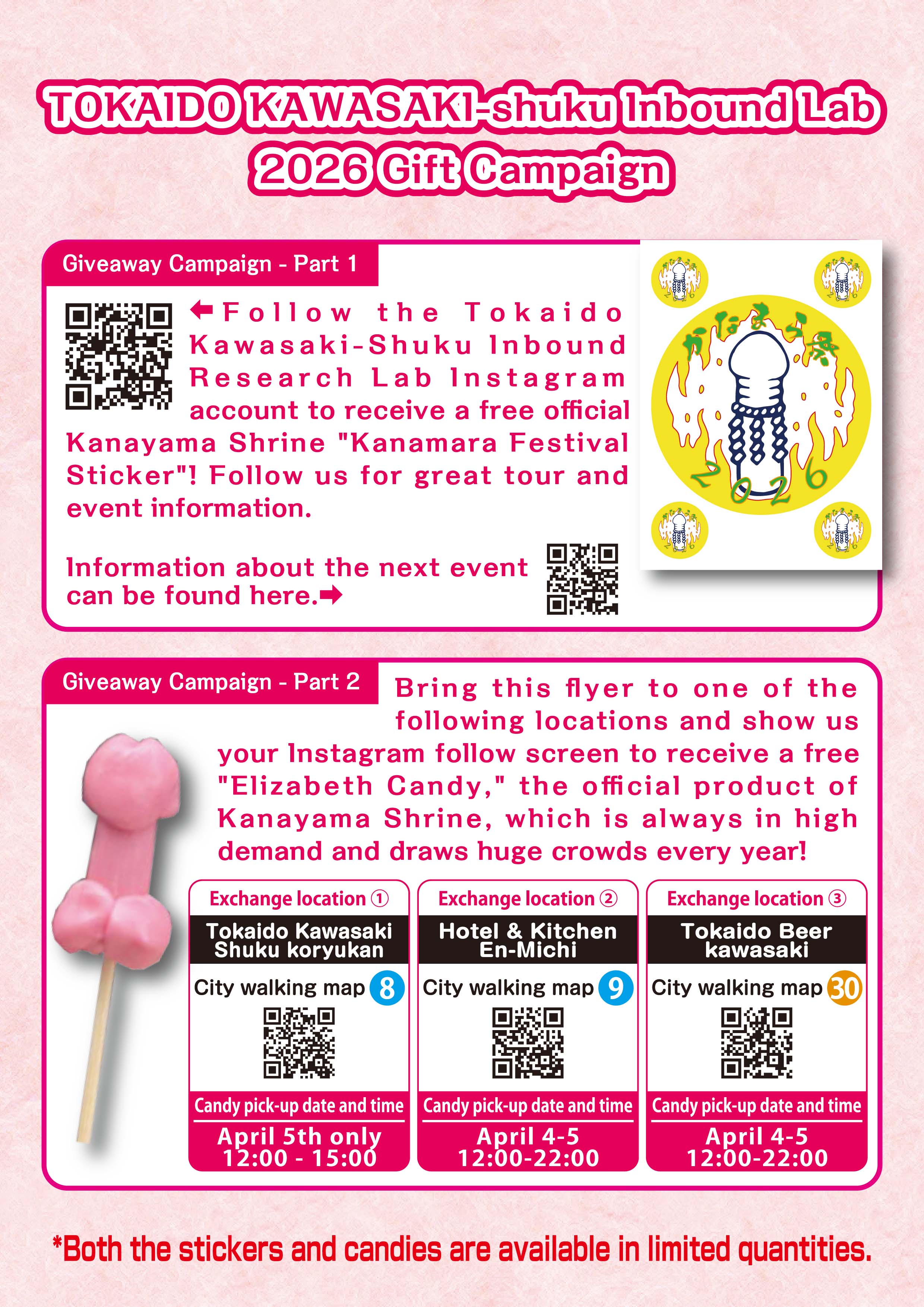 2026年4月5日(日)かなまら祭当日に、東海道川崎宿インバウンド研究会のinstagramアカウントをフォローして頂いた方に「かなまら祭公式ステッカー」をプレゼント致します。フォローして頂くとお得なツアー・イベント情報があります。さらに下記の施設に来て頂きinsutagramのフォロー画面を見せて頂いた方に、毎年大人気で大行列の「かなまら公式飴」をプレゼント!※いずれも数量には限りがあります。先着順無くなり次第終了
